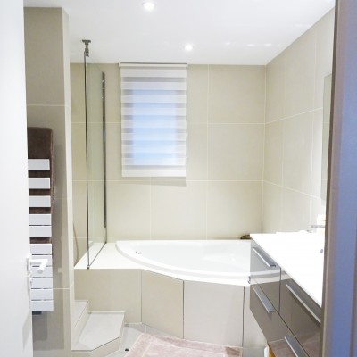 Côté salle de bain, nous avons choisi les matériaux dans les mêmes couleurs douces et naturelles que dans la chambre...